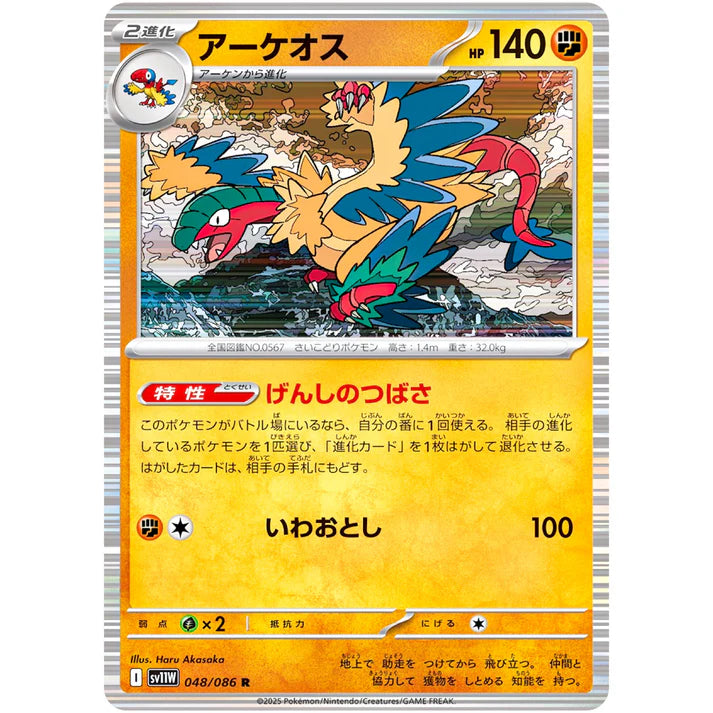 げんしのつばさこのポケモンがバトル場にいるなら、自分の番に1回使える。相手の進化しているポケモンを1匹選び、「進化カード」を1枚はがして退化させる。はがしたカードは、相手の手札にもどす。