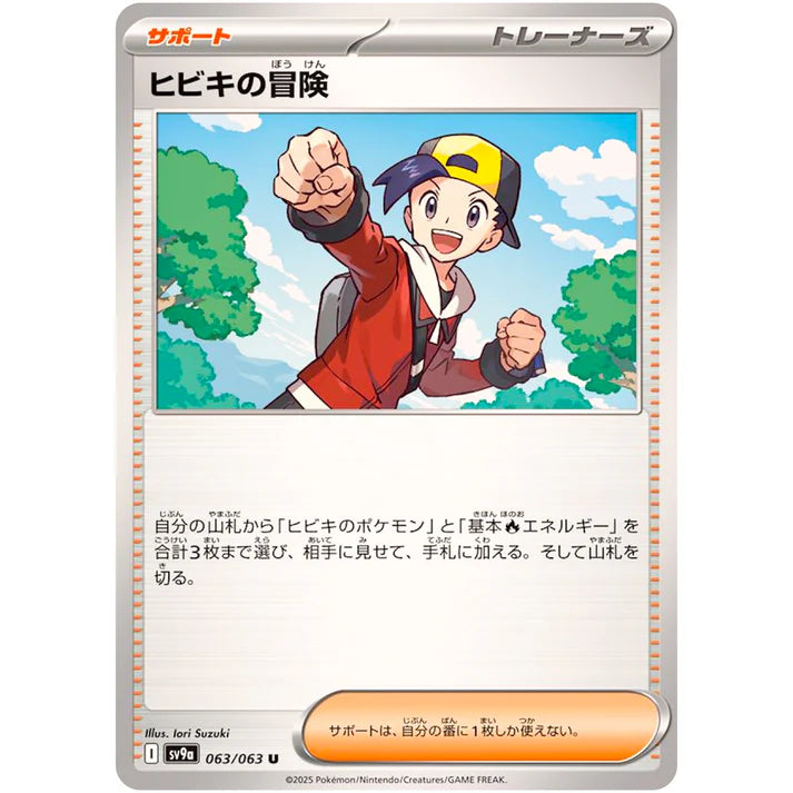 自分の山札から「ヒビキのポケモン」と「基本エネルギー」を合計3枚まで選び、相手に見せて、手札に加える。そして山札を切る。