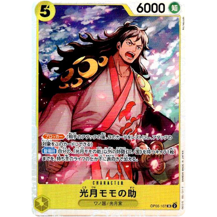 【ブロッカー】(相手のアタックの後、このカードをレストにし、アタックの対象をこのカードにできる) 【登場時】自分の、「光月モモの助」以外の特徴《ワノ国》を持つキャラ1枚までを、持ち主のライフの上か下に表向きで加える。